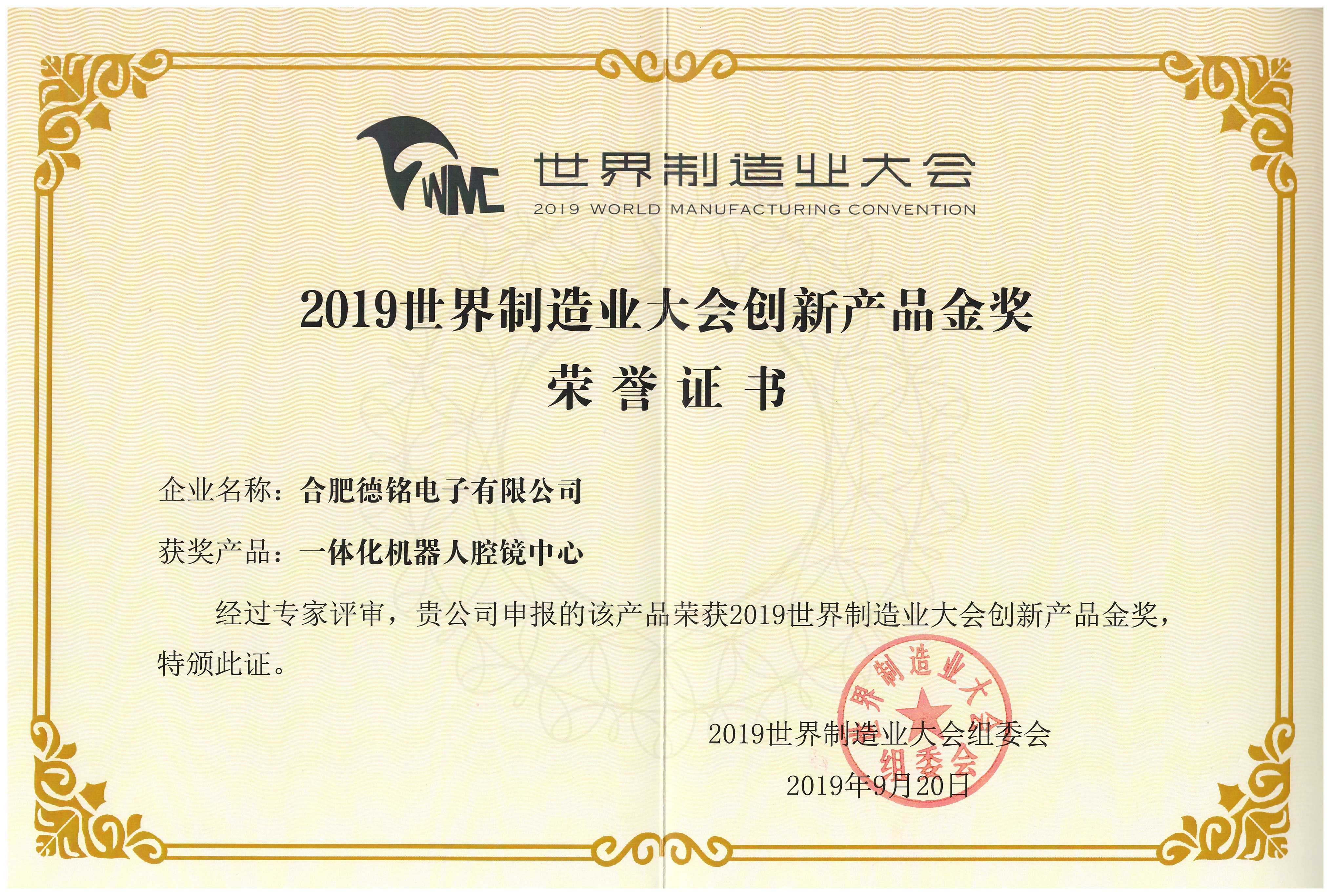2019年世界制造業(yè)大會創(chuàng)新產品金獎榮譽證書